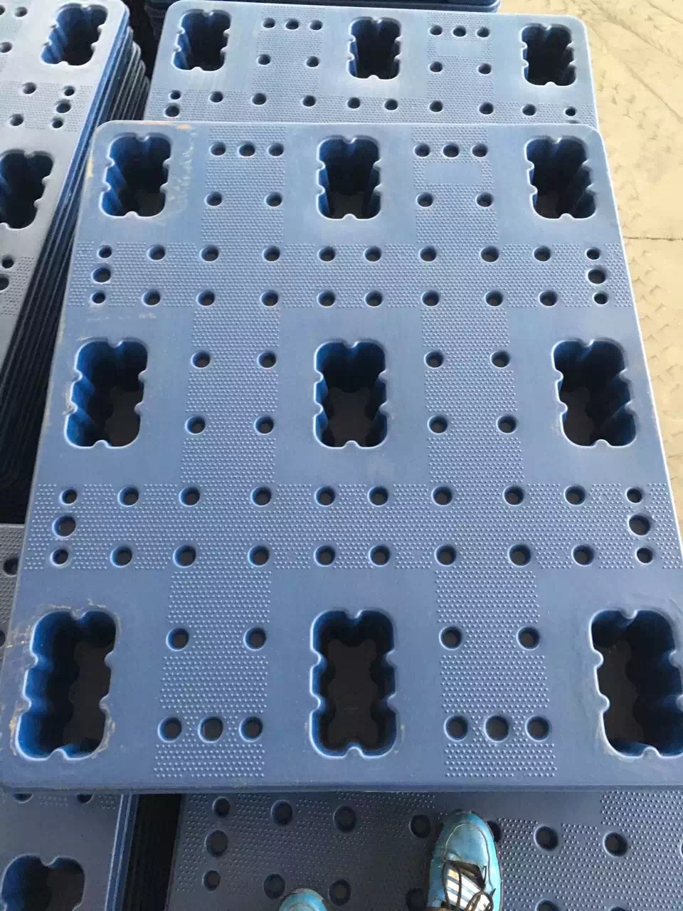 5、白色的九腳網格托盤其資料請求更嚴,因為摻有其它資料的九腳網格托盤是做不出白色或半透明商品的。不過通常場合咱們更多的運用藍色(天蘭色)的九腳網格托盤。